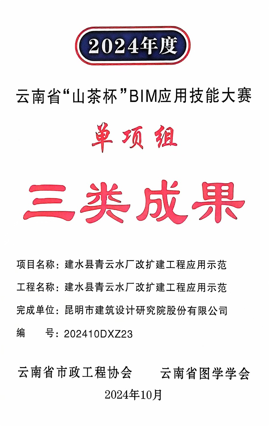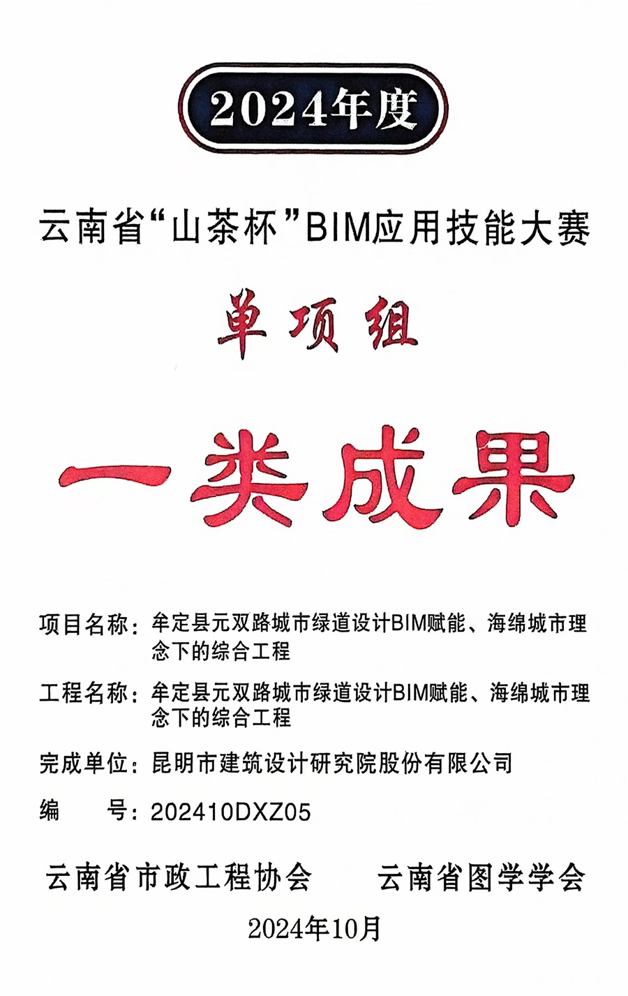 12月19日,在云南省第三屆(2024年)“山茶杯”BIM 應(yīng)用技能大賽中,公司團(tuán)隊(duì)參賽的“牟定縣元雙路城市綠道設(shè)計(jì)BIM賦能、海綿城市理念下的綜合工程”項(xiàng)目榮獲“單項(xiàng)組一類(lèi)成果獎(jiǎng)”,參與人員張建濤、李艷玲、何亮、鄭欣欣、陳烈、孔容杰、劉奇、江瑩妍、令偉宏、王偉榮獲“個(gè)人優(yōu)秀創(chuàng)新獎(jiǎng)”;“建水縣青云水廠(chǎng)改擴(kuò)建工程應(yīng)用示范”項(xiàng)目榮獲“單項(xiàng)組三類(lèi)成果獎(jiǎng)”,參與人員申偉弦、王一茹、王麗、溫紹波、顧寒飛、白立黎、李柯穎、殷博、張思玉則榮獲該項(xiàng)目的“個(gè)人優(yōu)秀創(chuàng)新獎(jiǎng)”。
