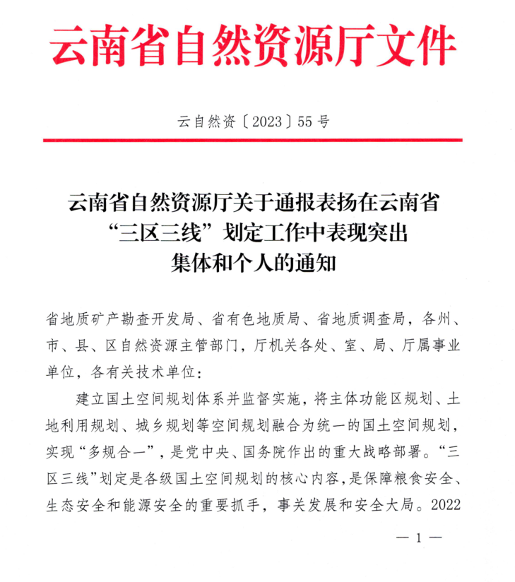 日前,公司收到了《云南省自然資源廳關(guān)于通報表揚(yáng)在云南省“三區(qū)三線”劃定工作中表現(xiàn)突出集體和個人的通知》,受到了集體通報表揚(yáng)。